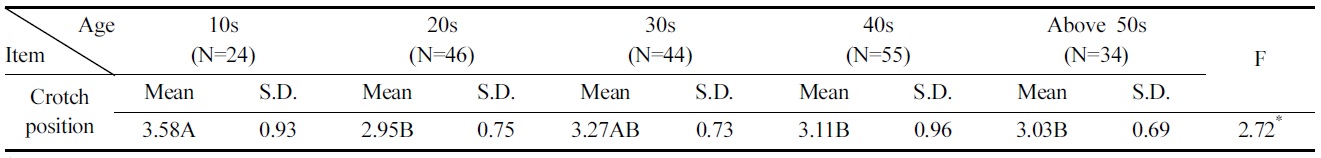 연령대에 따른 승마바지 치수 만족도를 분석한 결과, ‘밑위부위’(p<.05)에서만 유의한 차이가 나타났다(Table 4). 연령대가 높을수록 ‘밑위부위’ 만족도가 낮게 나타났고, 특히 10대는 다른 연령대에 비하여 ‘밑위부위’ 만족도가 높게 나타났다. 이는 밑위 수준이 바지 스타일에 따라 유동적으로 결정되는 기준선으로서(Yoon et al., 2007) 승마바지의 밑위수준은 일반바지에 비해 짧기 때문에 다른 연령대에 비해 밑위길이가 짧은 10대의 만족도가 상대적으로 높은 것으로 사료된다.
