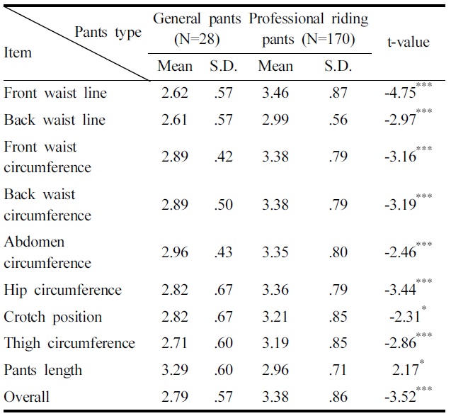 승마 시 착용하는 바지종류에 따른 치수 만족도 차이를 살펴본 결과(Table 5), ‘앞허리선’(p<.005), ‘뒤허리선’(p<.005), ‘앞허리둘레’(p<.005), ‘뒤허리둘레’(p<.005), ‘배둘레’(p<.005), ‘엉덩이둘레’(p<.005), ‘밑위부위’(p<.05), ‘넙다리둘레’(p<.005), ‘바지길이’(p<.05), ‘전체맞음새’(p<.005)에서 유의한 차이가 나타났다. 전문승마바지가 일반바지에 비하여 상대적으로 ‘바지길이’를 제외한 모든 항목에서 치수 만족도가 높은 것으로 나타났다. 전문승마바지가 일반바지에 비하여 ‘바지길이’에서 만족도가 낮게 나타난 이유는 국내에서 시판되는 전문승마바지의 대부분이 선진국 브랜드의 수입 제품으로서 한국 성인의 하반신 체형을 제대로 반영하지 않은 바지 치수체계 때문이라고 할 수 있다. 특히 승마바지의 바지길이는 일반바지처럼 수선이 어려우므로 한국 성인의 하반신 체형을 고려한 승마바지 치수체계의 개선이 필요함을 알 수 있다.