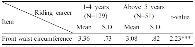 승마경력에 따른 승마바지 치수 만족도의 차이를 살펴본 결과(Table 6), ‘앞허리둘레’(p<.005)에서만 유의한 차이가 나타났다. 승마경력 5년 이상은 4년 이하에 비해 ‘앞허리둘레’에서 상대적으로 만족도가 낮게 나타났다. 이는 승마경력이 많을수록 승마자세에서 승마바지의 앞허리둘레선이 뒤허리둘레선과 수평면을 유지하면 편안하고 안정감을 주는 경험을 쌓았기 때문이라고 할 수 있다.