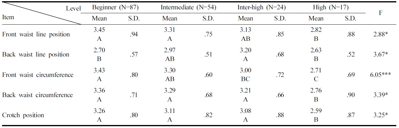 한편 조사대상자가 생각하는 승마실력에 따른 바지 치수 만족도 차이를 살펴본 결과(Table 7), ‘앞허리둘레’(p<.005) 이외에도 ‘앞허리선’(p<.05), ‘뒤허리선’(p<.05), ‘뒤허리둘레’(p<.05), ‘밑위부위’(p<.05)에서 유의한 차이가 나타났다. 자신의 승마실력이 높다고 인지할수록 승마바지의 허리부위 및 밑위부위의 치수 만족도가 낮게 나타났다. 이는 승마바지의 기본 치수로 허리둘레를 기준으로 선택되지만 앞허리둘레와 뒤허리둘레가 세분화되지 않고 한국인의 밑위길이나 바지길이와 같은 치수가 승마바지 치수에 반영되지 않았기 때문이라고 생각된다. 이러한 결과는 Kang and Kwon(2013)의 연구에서 정자세의 승마자세 변화에 따라 승마바지의 뒤허리길이가 증가하고 앞허리길이가 감소한다는 결과와도 관련이 있어 승마운동 시 승마바지의 앞, 뒤허리선위치 변화로 바지허리와 밑위부위가 맞지 않다고 인지한 것으로 사료된다. 즉, 승마실력이 높을수록 다양한 승마바지 착용경험과 전문적인 지식을 쌓게 되어 승마바지의 허리부위와 밑위부위 치수만족도가 낮은 것으로 분석된다. 따라서 승마실력이 높은 소비자들의 치수만족도를 높이기 위해서 허리둘레를 앞허리둘레, 뒤허리둘레로 세분화하고 앞뒤 밑위길이의 치수를 승마바지의 패턴 설계에 각각 반영해야 할 것으로 사료된다.