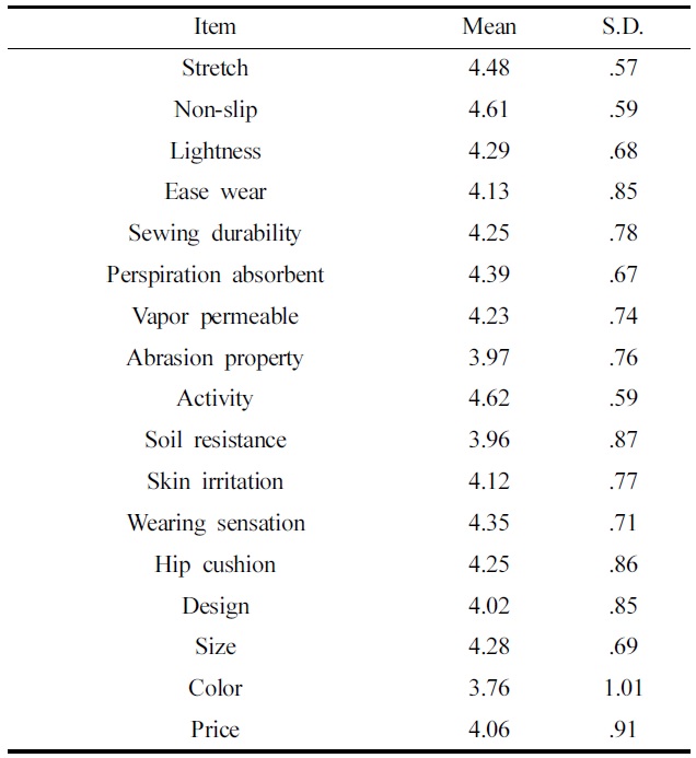승마바지의 성능 중요도를 살펴본 결과(Table 8), 승마바지의 성능에 대해서는 전체적으로 중요하게(4점 이상) 인식하고 있는 것으로 나타났다. 특히 승마바지 소재의 ‘신축성’, ‘미끄럼방지성’, ‘활동성’이 더욱 중요하게 고려하는 것으로 나타났다. 이는 승마 시 무릎관절의 반복동작과 유연성을 요구하는 운동이기 때문에 다양한 신체변형에 따른 승마바지 소재의 ‘신축성’과 ‘활동성’을 매우 중요하게 평가한 것으로 생각된다. 또한, 승마와 관련된 사고 중 말에서 떨어지는 낙마 사고가 가장 많이 발생하여(Abu-Kishk et al., 2013; Ball et al., 2009; Chitnavis et al., 1996; Smartt & Chalmers, 2009) 승마바지 착용 후 자유로운 운동도 중요하지만 말 등에서 미끄러짐을 방지하기 위해 ‘미끄럼방지성’을 중요하게 평가한 것으로 생각된다. 이 결과에서 승마바지는 표면마찰 저항이 큰 PU 또는 실리콘 코팅소재나 신축성이 우수한 인조 스웨이드 소재로 된 패치가 사용되어야 함을 알 수 있었다.