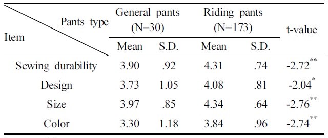 승마 시 착용하는 바지종류에 따른 성능 중요도 차이를 분석한 결과(Table 9), ‘사이즈’(p<.05) 이외에도 ‘봉제내구성’(p<.01), ‘디자인’(p<.05), ‘색’(p<.01)에서 각각 유의한 차이가 나타났다. 전문승마바지를 착용하는 소비자는 일반바지를 착용하는 소비자에 비하여 ‘봉제내구성’, ‘디자인’, ‘사이즈’, ‘색’을 더 중요시하는 것으로 나타났다.
