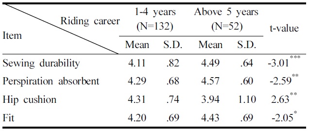 5. 승마경력과 실력이 높을수록 승마바지의 ‘봉제내구성’, ‘땀흡수성’, ‘사이즈’를 중요하게 고려한 반면, 승마경력과 실력이 낮을수록 ‘엉덩이 쿠션성’을 중요하게 고려하는 것으로 나타났다. 따라서 전문가용 승마바지 소재는 땀을 원활하게 흡수할 뿐만 아니라 흡수된 땀이 방출될 수 있는 소재를 사용해야 하며, 다양한 신체변형과 승마운동에 따른 배김 없이 강도를 유지할 수 있는 봉제솔기를 사용하도록 유의하고, 초보자용 승마바지의 밑위와 엉덩이부위 소재는 충격흡수성도 고려되어야 할 것이다.