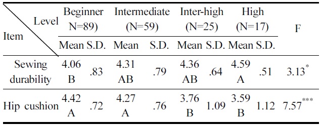 승마경력에 따른 승마바지 성능 중요도 차이를 분석한 결과는 Table 10에 나타냈다. 승마경력에 따라 ‘봉제내구성’(p<.005), ‘땀흡수성’(p<.01), ‘엉덩이 쿠션성’(p<.01), ‘사이즈’(p<.01)에서 각각 유의한 차이가 나타났다. 5년 이상의 경력자는 4년 이상의 경력자에 비하여 ‘봉제내구성’, ‘땀 흡수성’, ‘사이즈’를 더 중요하게 생각하는 것으로 나타난 반면, ‘엉덩이 쿠션성’은 덜 중요하게 생각하는 것으로 나타났다. 조사대상자가 생각하는 승마실력에 따른 성능 중요도를 차이를 분석한 결과(Table 11), ‘봉제내구성’(p<.05)과 ‘엉덩이 쿠션성’(p<.005)에서 유의한 차이가 나타났다. ‘봉제내구성’은 승마실력이 높을수록 중요하게 생각하는 반면, ‘엉덩이 쿠션성’은 승마실력이 낮을수록 중요하게 생각하는 것으로 나타났다. 이는 승마경력과 실력이 높을수록 다양한 승마바지를 착용한 경험을 바탕으로 승마바지의 소비성능을 더 중요시하기 때문이라고 사료된다. 승마경력과 실력이 낮을수록 ‘엉덩이 쿠션성’을 중요시하였는데 이는 부자유스러운 승마운동으로 안장과 엉덩이부위 마찰과 충격이 증가하였기 때문이라고 생각된다. 따라서 승마바지의 엉덩이 부위 소재는 승마동작에 따른 운동으로 땀을 원활하게 흡수할 수 있어야 할 뿐만 아니라 흡수된 땀이 빨리 방출될 수 있는 복합기능 소재를 사용해야 한다. 또한 하반신과 안장과의 마찰에 지탱할 수 있도록 봉목강도가 우수하게 유지되어야 하며 승마운동에 의한 찰과상을 입기 쉬운 종아리부위와 무릎부위의 패치는 평편하고 얇은 솔기로 봉제해야 할 것이다.