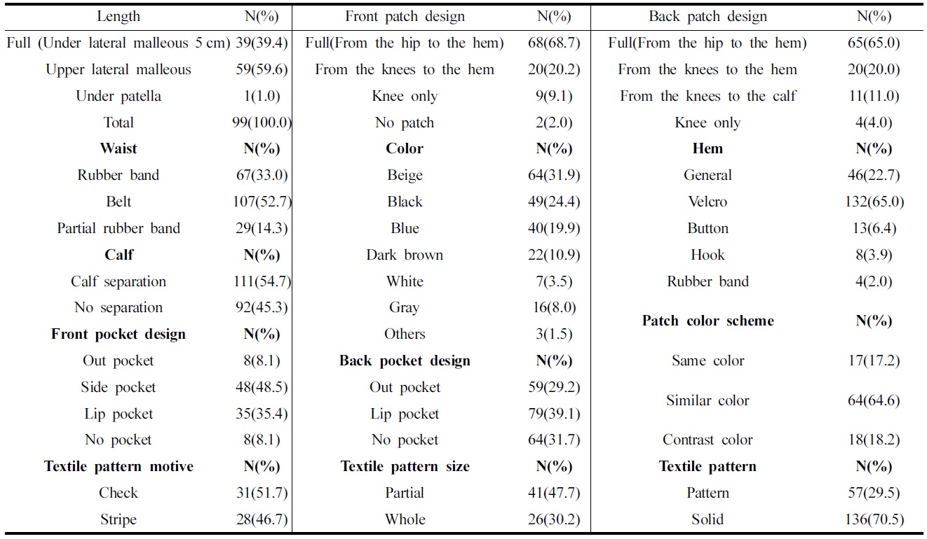 승마바지 디자인 선호도를 살펴보기 위해 빈도분석을 실시한 결과는 Table 12에 나타냈다. 조사대상자의 59.6%가 9부 길이의 승마바지를 선호하는 것으로 나타났다. 승마바지 길이로서 9부를 선호하는 이유는 허리둘레나 엉덩이둘레를 기준으로 승마바지를 구입하기 때문에 서양인에 비해 하반신 길이가 작은 한국인에게 승마바지 길이가 길어서 한국인 체형에 맞는 9부 길이의 승마바지 개발이 필요하다고 하겠다. 이는 승마바지의 치수 만족도에 대한 조사에서 바지길이 항목에 대해 가장 불만족한 비율이 높게 나타났던 결과와도 연관된다고 하겠다.