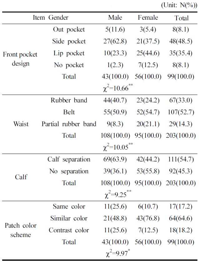 성별에 따른 승마바지 디자인 선호도를 X2-검정한 결과, Table 13에 제시한 것과 같다. 성별에 따라 ‘앞포켓’(p<.01), ‘허리’(p<.01), ‘종아리형태’(p<.01), ‘원단과 패치배색’(p<.05)에서 유의한 차이가 나타났다. ‘앞포켓’의 형태에서 남성은 사이드 포켓(27.3%)을, 여성은 입술포켓(25.3%)을 각각 선호하는 것으로 나타났다. 승마바지의 ‘허리형태’로는 성별에 상관없이 벨트형을 가장 선호하였으나, 남성은 여성에 비하여 고무밴드허리형을 더 선호하는 것으로 나타났다. 이는 남성이 여성에 비해 승마자세시 배둘레가 편안한 것을 더 중요하게 생각하며 여성은 남성에 비해 허리가늘어 보이는 외관을 더 중요하게 생각하기 때문이라고 할 수 있다. ‘종아리형태’에서는 남성은 종아리 절개형(63.9%)을, 여성은 종아리 절개 없는 형(55.8%)을 가장 선호하는 것으로 나타났다. 승마바지 ‘원단과 패치배색’은 성별에 상관없이 유사색상을 선호하나, 남성이 여성에 비하여 동일색상과 대조배색을 더 선호하는 것으로 나타났다. 남성 승마바지는 벨트형 또는 고무밴드허리형과 사이드형 앞포켓으로 디자인하고 종아리는 절개해서 디자인해야 한다. 여성 승마바지는 벨트형 허리와 입술형 앞포켓으로 디자인하고 종아리는 절개하지 않고 디자인하더라도 활동성이 확보가 가능하도록 해야 한다.