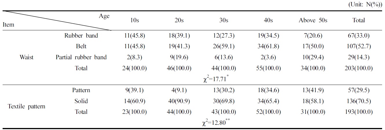 연령대에 따른 승마바지 디자인 선호도의 차이를 분석하고자 X2-검정한 결과는 Table 14에 나타냈다. 연령대에 따라 승마바지 ‘허리’(p<.05)와 ‘패턴’(p<.01)에서 유의한 차이가 나타났다. 벨트형 허리는 30대 이후가 20대 이하보다 상대적으로 더 선호하는 것으로 나타났고, 고무허리밴드형은 10대, 20대가, 부분적 고무허리밴드형은 50대 이상이 다른 연령대에 비하여 상대적으로 더 선호하는 것으로 나타났다. 20대 이하에서는 편안한 고무허리밴드를 선호하고 30대 이후부터 허리를 가늘게 보이는 외관을 더 중요하게 생각하지만 50대 이상이 되면 복부비만이 진행되기 때문에 벨트형과 고무허리밴드형의 중간의 부분고무허리밴드를 선호하는 것으로 사료된다. 이 결과에서 연령대별로 허리둘레 형태를 고려한 승마바지 디자인 기획이 필요하다고 하겠다.
