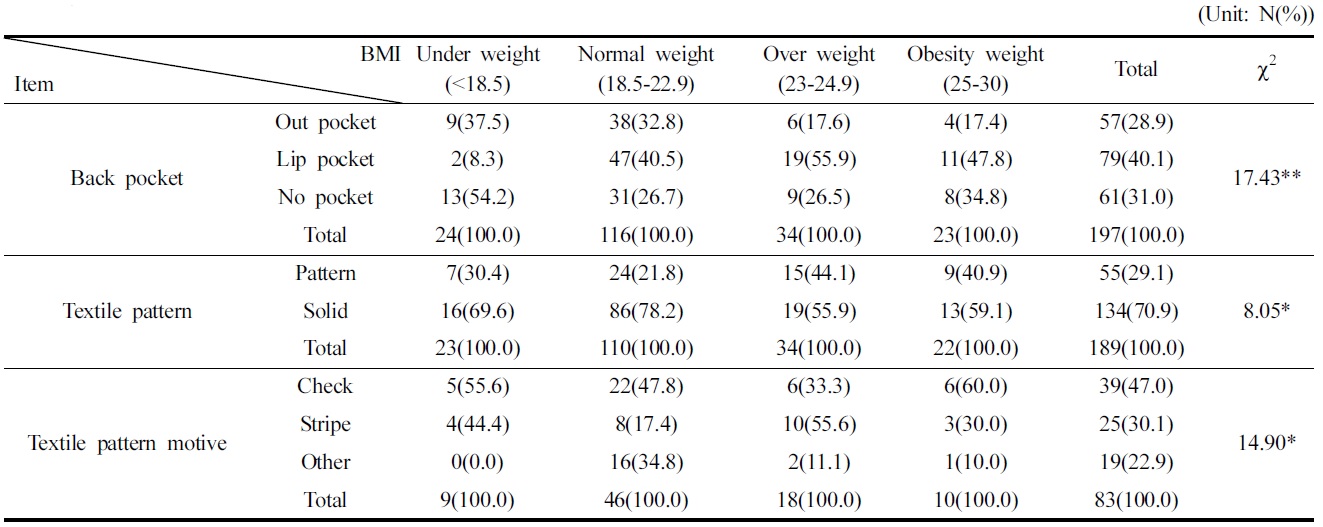 3. BMI에 따라 뒤포켓 형태 선호도에서 유의한 차이가 나타났다. 저체중은 뒤포켓 없이, 정상체중, 과체중, 비만형은 입술포켓의 승마바지로 차별화해야 할 것이다.