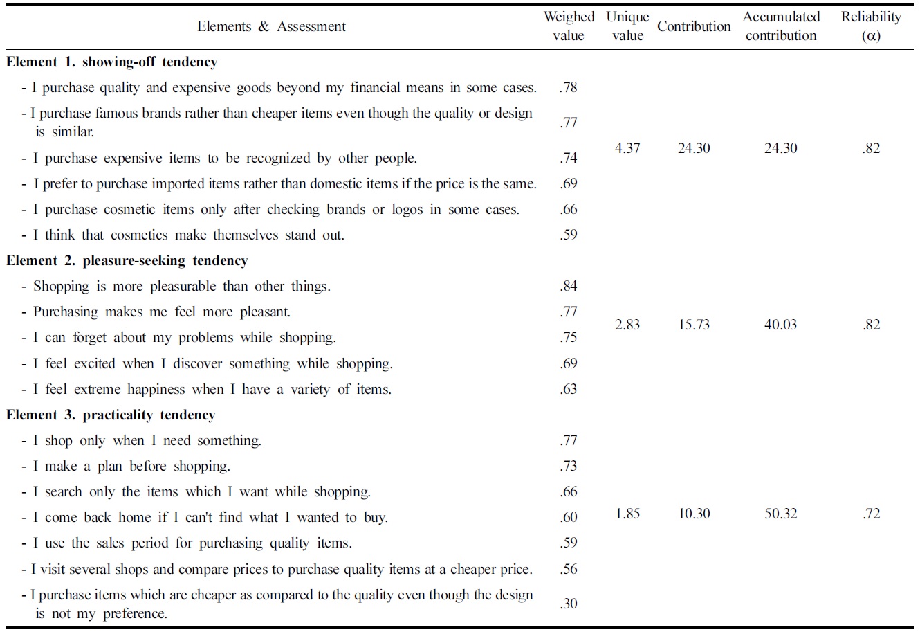 한‧중 여성 소비자의 쇼핑성향이 어떤 차원들로 구성되는가를 밝히기 위해 요인분석 한 결과 Table 1과 같이 과시추구성향, 쾌락추구성향, 실용추구성향의 3개 요인이 도출되었다. 요인 1은 화장품 구매 시 형편에 비해 고급스럽고 비싼 것을 구매한다거나, 유명 상표, 고가 제품, 브랜드와 로고 등을 보고 구매하는 문항들로 구성되어 ‘과시추구성향’이라 명명하였다. 요인 2는 쇼핑 시간의 즐거움, 제품 구입의 즐거움, 쇼핑에의 흥분감에 대한 문항으로 구성되어 ‘쾌락추구성향’이라 명명하였다. 요인 3은 필요한 물건이 있을 경우에만 구매, 사전 계획 구매, 자신에게 꼭 맞는 제품만 구매, 저렴한 구매를 위해 매장을 방문해서 가격 비교하거나 품질에 비해 가격이 저렴하면 구매한다는 문항으로 구성되어 ‘실용추구성향’이라 명명하였다.