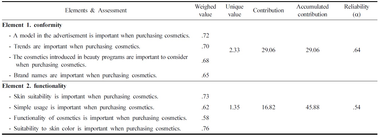 한‧중 여성 소비자의 화장품 속성에 대한 중요도가 어떤 차원들로 구성되는지를 밝히기 위해 요인분석 한 결과 Table 2와 같이 동조성과 기능성의 2개 요인이 도출되었다. 요인 1은 화장품 구매 시 광고 모델, 유행, 뷰티 프로그램에서 소개된 제품, 브랜드명에 대한 중요도를 평가하는 문항들로 구성되어 ‘동조성’이라 명명하였다. 요인 2는 화장품 구매 시 피부의 적합성, 사용의 편리함, 제품의 기능성, 자신의 피부 톤에 어울리는 지에 관해 그 중요성을 평가하는 문항들로 구성되어 ‘기능성’이라 명명하였다.