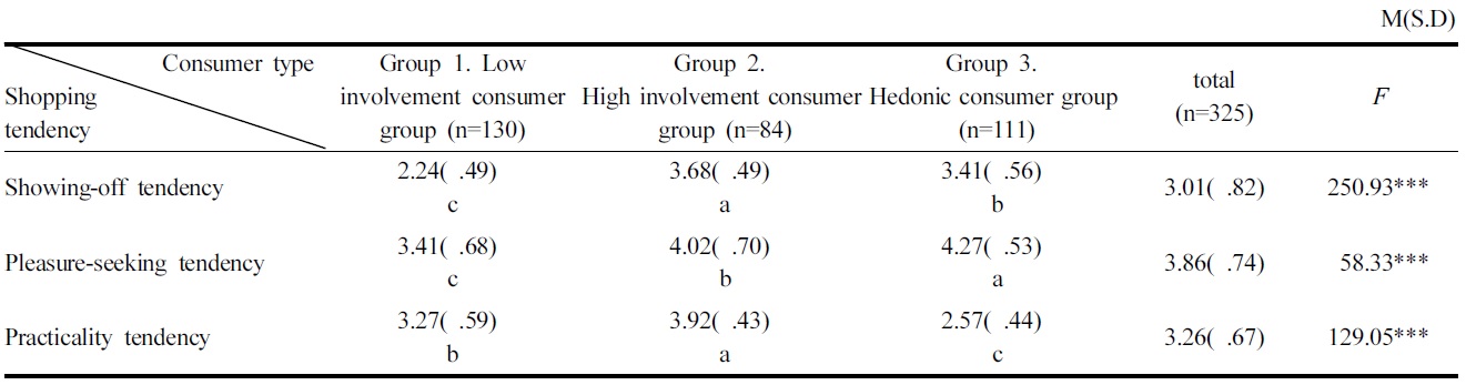 쇼핑성향에 따른 소비자유형 분류를 위하여 K-means 군집분석 한 결과 Table 3과 같이 3개의 집단으로 분류되었다.