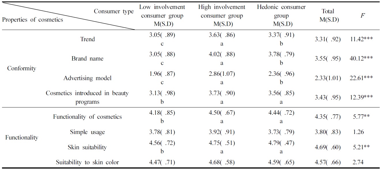 한‧중 여성 소비자의 쇼핑성향에 따른 소비자유형별 화장품 속성 중요도를 비교하기 위해 분산분석한결과 Table 4와 같이 전반적으로 소비자유형별 화장품 속성에 유의한 차이가 있었다. 화장품 구매 시 여성들은 화장품의 기능성과 동조성을 대체로 중요시 하는 것으로 나타났는데, 평균 점수를 비교해 볼 때 세 집단 모두 기능성을 더 중요시 하는 것으로 평가되었다.