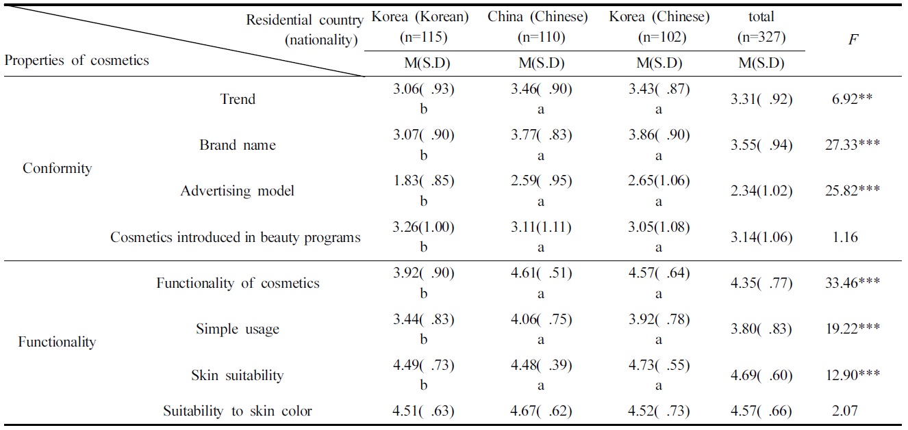 한‧중 여성들의 거주지(국적)별 화장품 속성 중요도를 비교하기 위해 분산분석 한 결과 Table 5와 같이 화장품의 동조성이나 기능성에 대체로 유의한 차이가 나타났고, 동조성보다는 기능성을 더 중요하게 고려하였다.