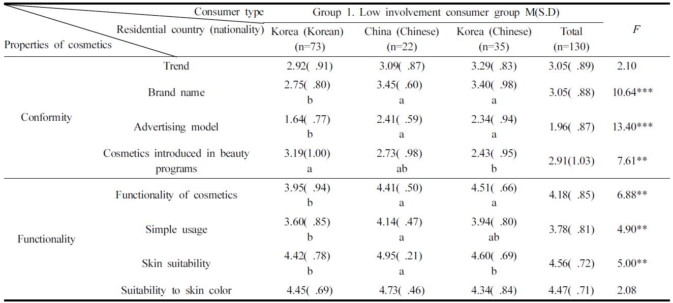 거주지(국적)별 저관여구매집단의 화장품 속성 중요도를 비교한 결과 Table 6과 같이 한국인 73명, 중국거주 중국인 22명, 한국거주 중국인 35명으로 나타나 저관여구매집단에는 한국인이 가장 많았다.