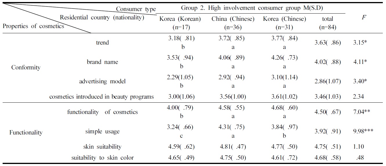 고관여구매집단 여성들은 화장품의 동조성에서 브랜드명, 광고모델, 유행에 대한 중요도에 대해 거주지(국적)별 유의한 차이가 있었다. 고관여구매집단 중국인의 경우 거주지와 상관없이 한국인보다 브랜드명과 유행을 더 중요하게 생각하였다. 그리고 중국인은 광고모델을 중요시 한 반면, 한국인은 중요시 하지 않았다. 화장품의 기능성에서는 제품의 기능성과 제품 사용의 편리함에 대해 거주지(국적)별 유의한 차이가 있었다. 고관여구매집단 중국인은 거주지와 상관없이 한국인보다 제품의 기능성을 더 중요하게 생각하였으며, 제품 사용의 편리함에 대해서는 중국거주 중국인이 가장 중요하게 생각하였다. 피부의 적합성이나 자신의 피부색에 잘 어울리는지에 대해서는 거주지(국적)별 유의차는 없었으나, 평균값은 아주 높게 나타나 화장품의 기능성 중 중요하게 생각하는 속성으로 볼 수 있다.