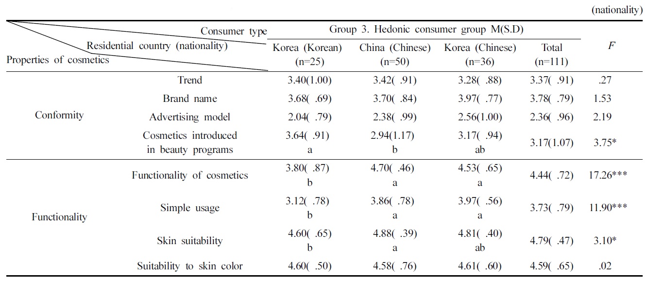 거주지(국적)별 쾌락적구매집단의 화장품 속성 중요도를 비교한 결과 Table 8과 같이 한국인 25명, 중국거주 중국인 50명, 한국거주 중국인 36명으로, 쾌락적구매집단은 중국거주 중국인이 가장 많았고, 그 다음으로 한국거주 중국인과 한국인 순서로 나타났다.