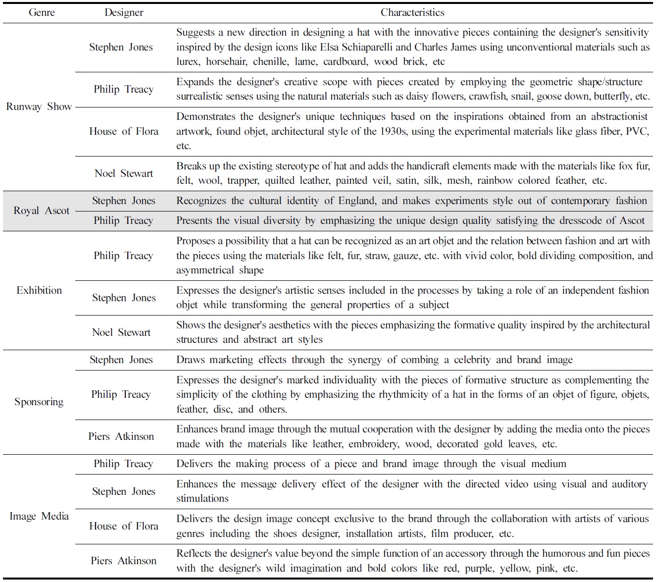 오늘날 현대 패션에서 디자이너의 활동 영역이 넓혀짐에 따라 오브제 햇 디자이너들도 작품을 제작한 경험으로 얻은 노하우를 다양한 장르에서 실험하며 개성있는 작품을 창출하고 있다. 특히 타 분야의 아티스트와의 협업으로 시·청각 감각의 자극을 통해 연출되는 분위기로 브랜드가 추구하는 이상미를 표현하고 있다. 이제까지 고찰한 장르 및 각 장르의 대표적 디자이너별 오브제 햇의 특성을 정리하면 Table 1과 같다.