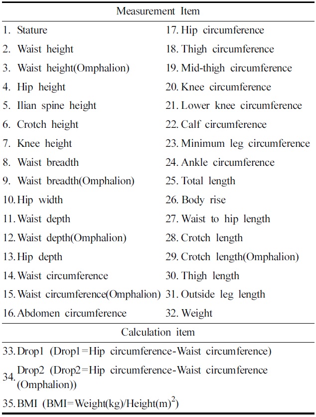 본 연구에서 분석에 사용된 계측항목은 의복제작에 기본적으로 필요하고 성인 남성의 하반신 체형을 파악할 수 있는 항목으로 높이 7항목, 너비 3항목, 두께 3항목, 둘레 13항목, 길이 7항목, 기타 2항목으로 총 35항목이다(Table 1).