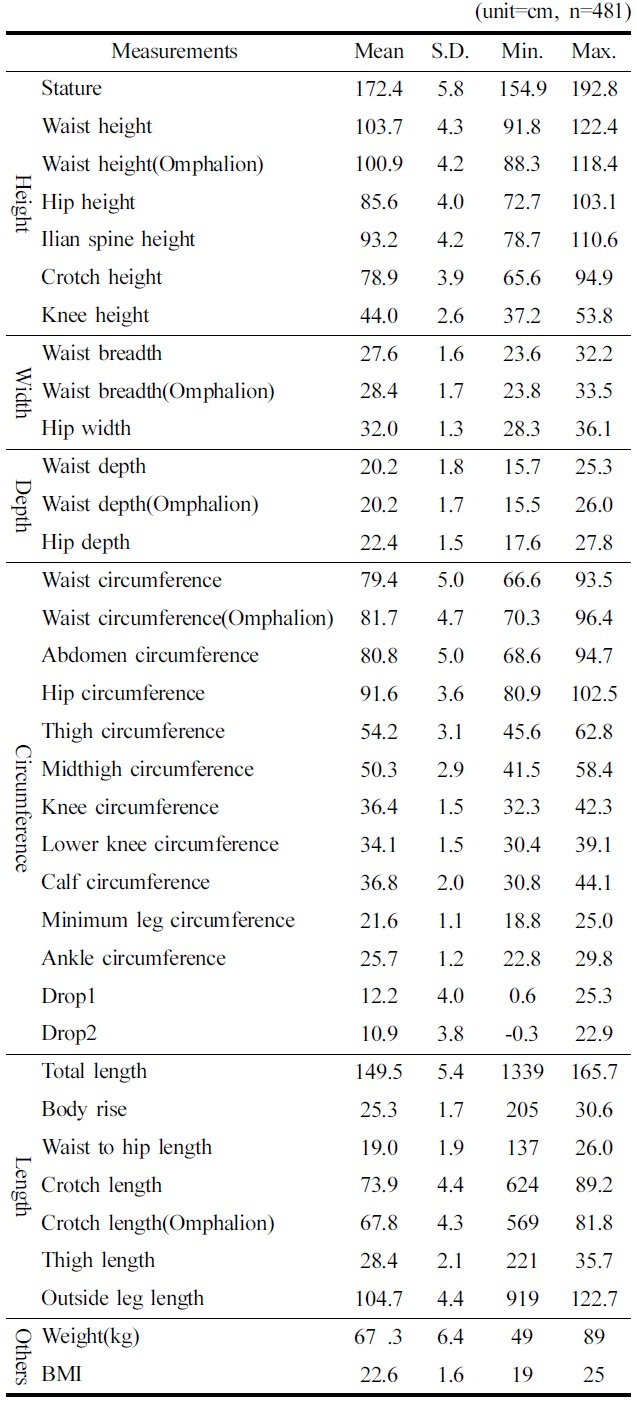 30대 성인 남성의 하반신 측정 항목에 대한 평균은 키는 172.4 cm, 몸무게는 67 kg, 허리둘레는 79.4 cm, 배꼽수준허리둘레는 81.7 cm, 배둘레는 80.8 cm, 엉덩이둘레는 91.6 cm으로 나타났다. 또한 키, 허리둘레, 총길이, 몸무게 등에서는 표준편차가 5.0 이상으로 크게 나타나 개인차가 큰 항목임을 알 수 있었다(Table 2).