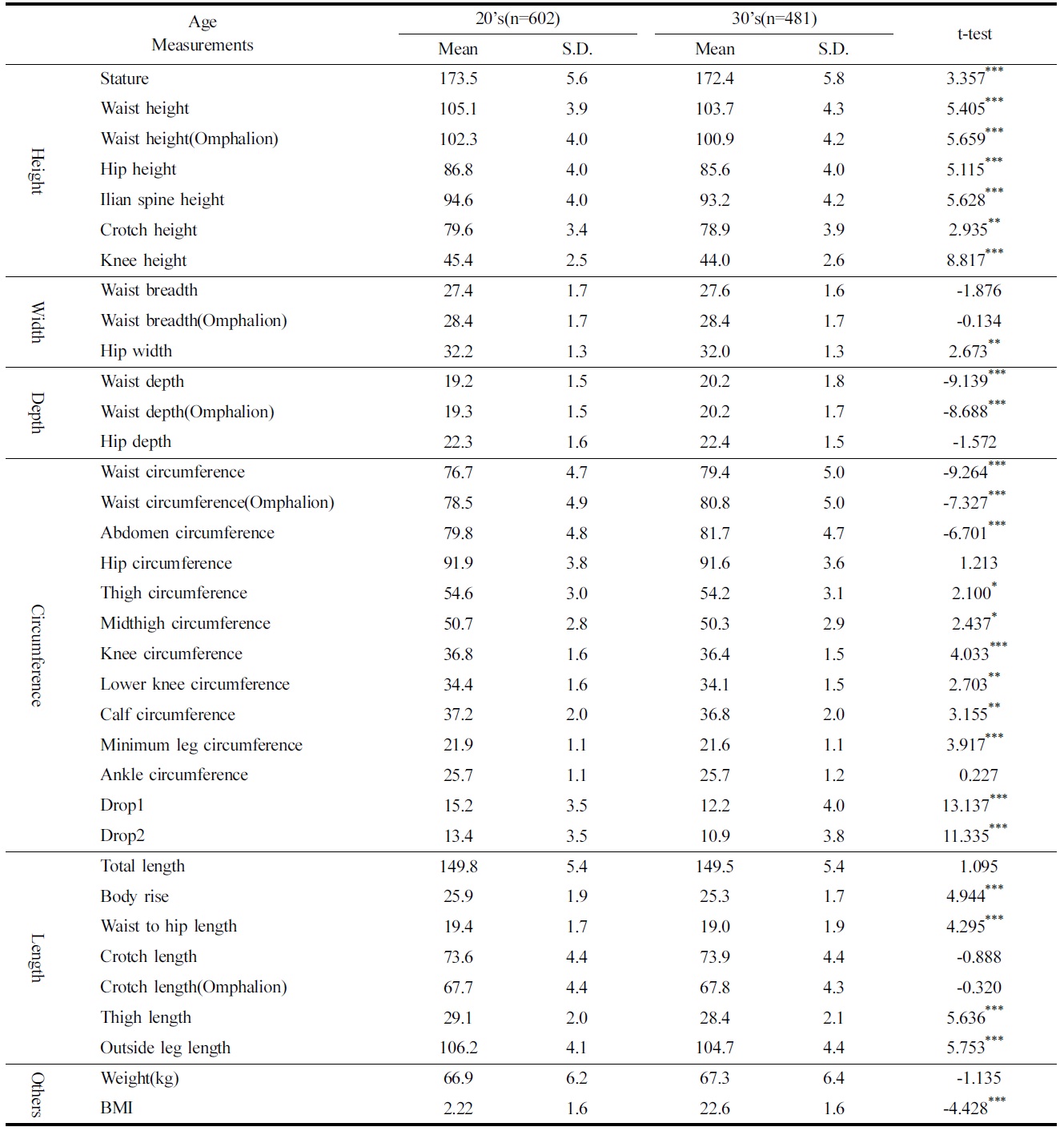 20대와 30대의 평균을 비교한 결과, 허리너비, 배꼽수준허리너비, 엉덩이두께, 엉덩이둘레, 발목최대둘레, 총길이, 샅앞뒤길이, 배꼽수준샅앞뒤길이, 몸무게 항목을 제외한 모든 항목에서 두 연령대간에 유의한 차이가 있었다(Table 3).