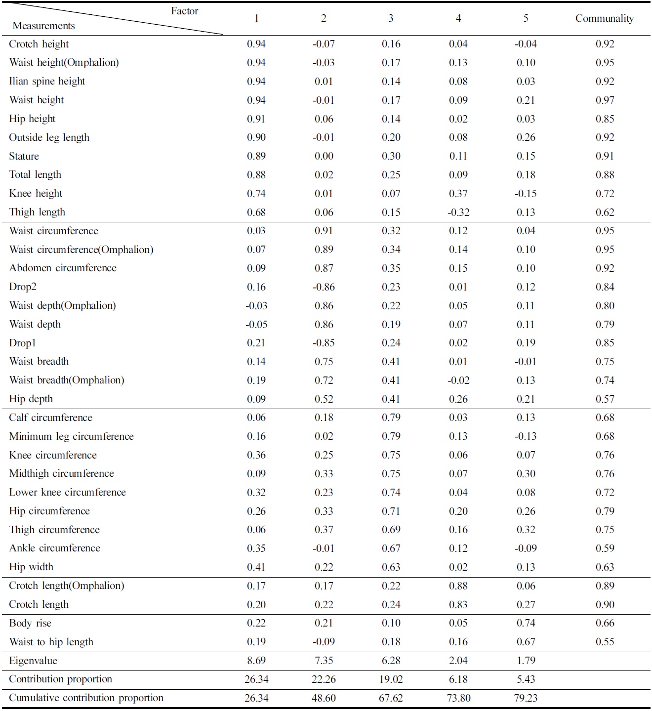 30대 성인 남성의 하반신 체형 요인분석에 사용한 항목은 높이 7항목, 너비 3항목, 두께 3항목, 둘레 13항목, 길이 7항목의 총 33항목으로 구성되었으며, 키를 포함한 인체측정 변수들을 반영하여 분석함으로써 사이즈의 특징을 나타낼 수 있도록 하였다. 요인분석은 고유치가 1.0 이상을 나타내는 주성분분석을 실시하였다. 요인분석을 한 결과 총 5개의 요인이 추출되었으며, 전체 변량의 79.23%를 설명하였다. 각 요인별 고유치와 전체 변량의 기여율 및 누적 기여율, 요인의 부하량을 Table 4에 나타내었다.