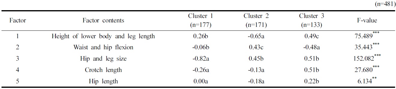 분류된 유형별로 30대 성인 남성의 하반신 체형의 유형별 형태특징을 살펴보기 위하여 각 유형별 요인점수와 군집에 대하여 일원배치 분산분석을 실시하고, 사후검정으로 Duncan-test를 실시하였다. 그 결과 5개의 요인 모두 유형별 유의한 차이가 있었다(Table 5).
