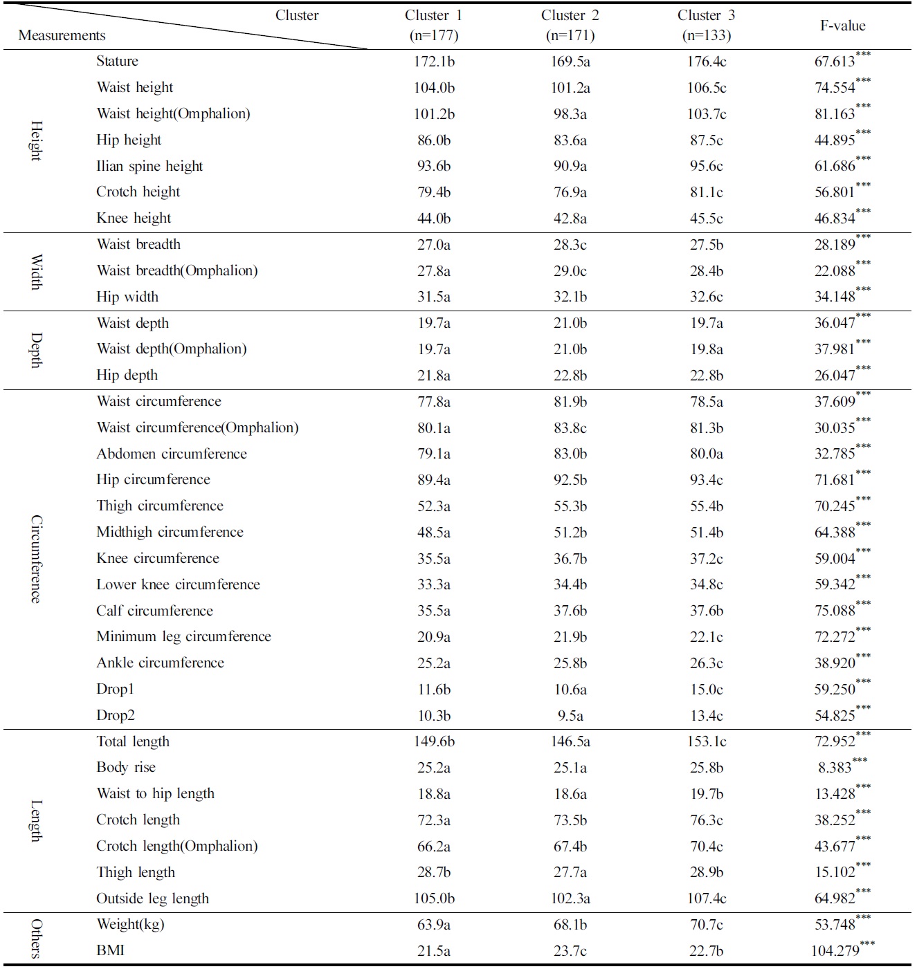 3) 30대 성인 남성의 하반신 체형의 유형을 분류하기 위하여 요인분석 결과에 의해서 군집분석을 실시하였다. 분류된 유형들의 차이를 밝히기 위해 일원배치 분산분석를 실시하였으며, 사후검정으로 Duncan-test를 하여 집단간의 차이를 검증하였다.