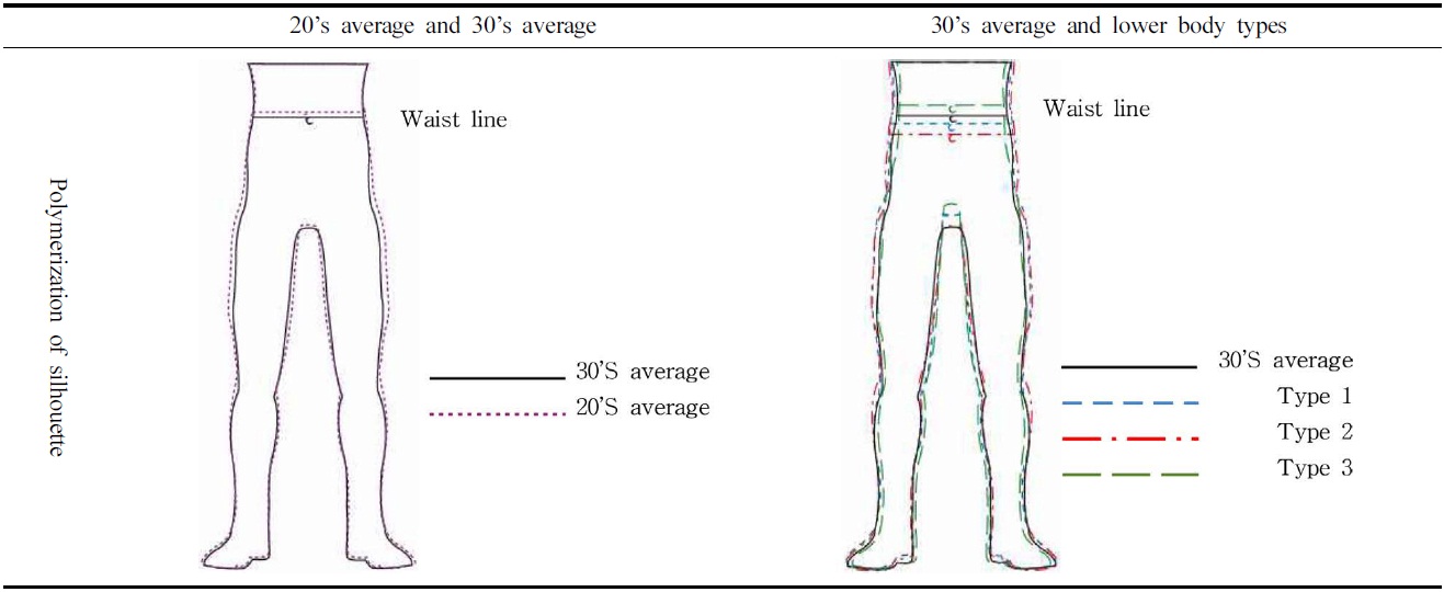 위에서 나타난 30대 성인 남성의 하반신 체형의 유형별 특징을 Optitex사의 PDS Version 12 프로그램을 사용하여 3차원 아바타 형상으로 제작하였고, 체형 비교를 위하여 20대 성인남성의 평균 체형의 아바타를 함께 제작하였다. Table 7에 20대 남성과 30대 남성의 평균 체형, 그리고 30대 남성의 세 유형의 대표 체형을 각각 전면, 측면, 후면으로 나타내었다. 아바타 형상으로 20대와 30대 남성의 평균을 비교해보면, 전면에서 20대와 30대의 하지 길이는 유사하게 나타났으나, 하지의 크기는 20대가 더 큰 것을 알 수 있었다. 측면을 비교해보면, 20대에 비해 30대의 복부의 크기가 크고, 넙다리, 무릎, 장단지에 이르는 하지의 크기도 30대가 더 두꺼운 것을 알 수 있었다. 후면에서는 전면과 마찬가지로 20대의 하지가 더 길고 큰 것을 알 수 있었다. 이것으로 20대는 넙다리부터의 하지가 좌우로 두꺼운 반면, 30대는 전후로 두꺼운 체형임을 알 수 있었다. 다음으로 보다 자세한 비교를 위하여, 각각의 체형의 전면 실루엣을 제작하여 20대와 30대 남성의 평균 체형의 실루엣을 중합하여 비교하였고, 30대 남성은 세 유형의 전면 실루엣을 평균 실루엣과 중합하여 그 차이를 비교하여 보았다. 그 결과, 20대는 30대에 비해 허리선과 샅높이, 무릎높이가 더 높게 나타나 하지의 길이가 더 긴 것을 알 수 있었으며, 넙다리에서 무릎에 이르는 하지부분의 크기가 큰 것을 알 수 있었다. 30대의 평균 실루엣을 30대의 각 유형별 실루엣과 비교해보면, 유형 3은 평균보다 허리선이 높았고, 유형 2와 유형 3은 평균보다 허리선이 낮은 것을 알 수 있었다. 또한 허리에서 엉덩이에 이르는 부위의 크기는 유형 3이 평균보다 작았으며, 샅높이는 유형 2가 평균과 비슷하고 유형 1과 유형 3은 평균보다 높았다. 넙다리에서 발목에 이르는 하지의 크기는 모두 평균보다 컸으며, 유형 2가 가장 큰 것을 알 수 있었다.