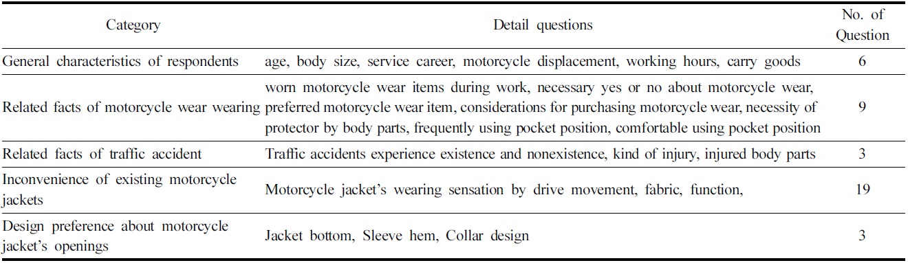 설문지 항목 구성은 먼저 선행연구와 함께, 퀵서비스 기사들의 작업을 직접 관찰하고 면담을 통해 예비조사를 위한 설문지를 작성하였고, 예비설문 조사 결과를 토대로 문제점을 파악하고 불편사항에 대해 더욱 구체화하여 본 조사를 위한 설문지를 구성하였다. 설문항목은 조사 대상자의 일반적 사항에 관한 6문항, 모터사이클웨어 착용에 관한 9문항, 주행사고에 관한 3문항, 모터사이클 주행 시 기존 재킷의 불만사항 19문항, 디자인 선호도에 관한 3문항 등 총 40문항으로 구성하였다. 조사대상자의 일반적 사항에 관한 문항에는, 연령, 신체치수, 근무경력, 작업용 모터사이클 배기량, 업무량, 휴대물품 문항으로 이루어졌다. 모터사이클웨어 착용에 관한 문항은 업무 시 착용하는 모터사이클웨어 아이템에 관한 문항, 작업 중 전용 모터사이클복 착용의 필요성, 선호하는 모터사이클웨어 형태, 구매 시 고려 사항, 신체 부위별 보호구 필요성에 관한 문항, 자주 사용하는 주머니 위치와 사용하기 편리한 주머니 위치에 관한 문항으로 구성되었다. 주행사고에 관한 문항은 사고 경험유무, 상해 종류, 상해 입은 신체부위에 대한 항목으로 구성되었다. 모터사이클 주행 시 기존 재킷의 불만사항에 대한 항목에는 주행시 동작에 따른 재킷의 신체 부위별 착용감, 소재, 기능성에 관하여 각각 5점 척도로 해당 문항을 선택하게 구성하였다. 또한 수납성에 대한 불편사항 유무와 그 이유를 묻는 문항도 기존 재킷에 대한 불편사항 항목에 추가하였다. 마지막으로 디자인에 관한 문항에서는 선호하는 재킷 소매 형태, 선호하는 재킷 밑단 형태, 선호하는 재킷 칼라 형태로 재킷 개구부 디자인에 관한 문항으로 마무리 하였다. 설문지 문항에 관한 사항은 Table 1에 제시하였다.