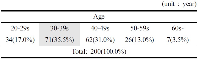 조사대상자의 연령은 30세에서 39세가 전체 200명 중 71명(35.5%)으로 가장 높게 나타났으며, 그 다음으로 40세에서 49세가 31.0%를 차지하였다. 30대, 40대, 20대, 50대, 60대 이상순으로 조사대상자의 연령별 빈도수가 높게 나타났으며 전체 조사대상자의 평균 연령은 40.02세로 집계되었다.