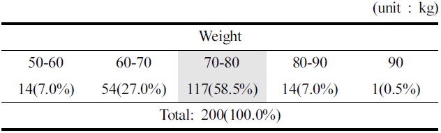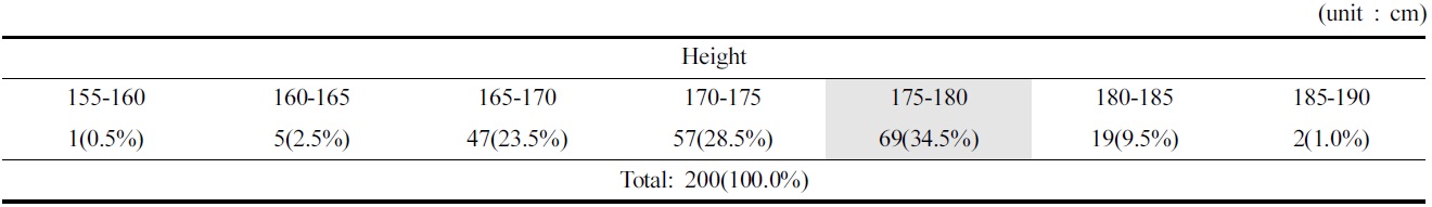 조사대상자의 신체치수 조사 결과 신장은 175 cm 이상 180 cm 미만이 69명(34.5%)으로 가장 많았고, 그 다음으로 170 cm 이상 175 cm 미만이 57명(28.5%)으로 높게 나타났다. 몸무게는 70 kg 이상 80 kg 미만이 117명으로 전체 58.5%를 차지하였으며, 평균 신장은 173.25 cm, 평균 체중은 70.26 kg으로 집계되었다. 조사대상자의 연령과 신체특성 관련 결과는 Table 2, Table 3, Table 4에 제시하였다.