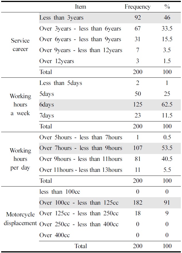 Table 5는 조사대상자의 근무경력, 근무량, 모터사이클 배기량 등 조사대상자의 일반적인 사항을 나타낸 것이다. 조사대상자의 퀵서비스 업체 운송 경력은 3년 미만이 92명으로 전체 46%를 차지하면서 가장 높은 비율로 나타났고, 다음으로 3년이상 6년 미만이 67명(33.5%)으로 높은 빈도수를 차지했다. 전체적으로 12년 이상 경력을 가진 운송업자는 3명으로 가장 적은 수를 차지했으며, 10년 이상의 장기 근로자가 많지 않은 직종임을 알 수 있다. 다음으로 조사 대상자의 하루 업무시간과 주 근무량을 살펴보면, 일 평균 8.66시간, 주 평균 5.85일 근무하는 것으로 조사되었다. 모터사이클 배기량 조사결과, 퀵서비스 운송업을 위해 업무용으로 사용하는 모터사이클의 배기량은 100cc 이상 125cc 미만이 91.9%로 가장 많이 사용하는 것으로 나타났다.