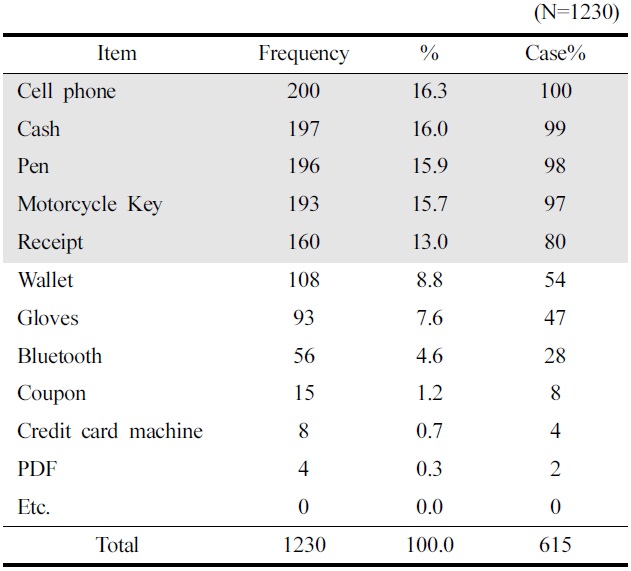 업무 시 휴대하는 물품에 대한 다중 응답 결과는 Table 6과 같다. 핸드폰 200명(16.3%), 현금 197명(16.0%), 볼펜 196명(15.9%), 모터사이클 키 193명(15.7%), 영수증 160(13.0%) 등으로 대다수의 조사대상자가 모두 업무 중 물품을 휴대하는 것으로 나타났다. 이에 따라 모터사이클 재킷에는 다양한 물품을 수납할 수 있는 포켓의 형태 및 포켓 수가 고려되어야 함을 알 수 있다.