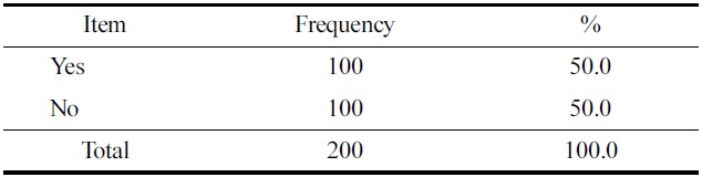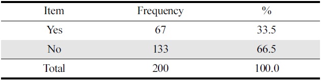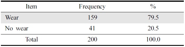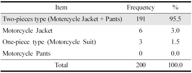 조사 대상자의 퀵서비스 운송업무 중 모터사이클 전용복 착용 유무에 대한 결과는 159명(79.5%)이 착용한다고 응답했으며, 나머지 41명(20.5%)은 미착용으로 나타났다. 이에 따라 퀵서비스 운송업자 대부분이 모터사이클 전용복을 업무 시 착용하는 것으로 나타나 그 필요성과 이용정도가 높은 것으로 알 수 있다(Table 7). 반면 41명(20.5%)의 미착용자의 경우, 근무시 아웃도어 재킷이나 등산용 바지 또는 일반적인 기성복을 착용하는 것으로 조사되었다. 이는 Table 5의 근무경력 결과, 3년 이하가 92명(46%)으로 가장 높이 집계되었으며 이러한 낮은 근무경력으로 인한 주행사고 미경험에 의해 모터사이클 전용복 착용에 의한 안전성과 작업효율 향상에 대한 인지가 낮은 것으로 사료되었다.