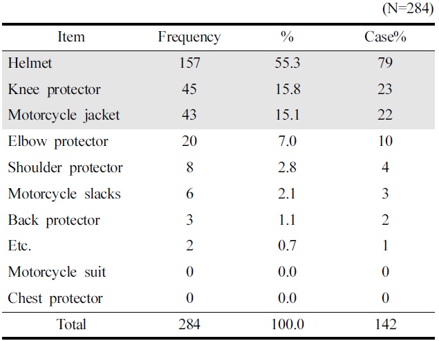 다음으로 업무 시 모터사이클 전용 복을 착용하는 조사대상자를 대상으로 착용하는 모터사이클복과 보호 장비에 대한 다중 응답 조사 결과 헬멧이 157명으로 가장 많이 착용하는 보호 장비로 나타났으며, 그 다음으로 무릎보호대 45명, 모터사이클전용 재킷 43명, 팔꿈치 보호대 20명, 어깨보호대 8명, 모터사이클전용 바지 6명, 등보호대 3명 순으로 나타났다. 결과적으로 도로교통법에 따라 의무적으로 착용해야하는 헬멧이 가장 높은 비율을 차지하였으며, 머리, 팔꿈치, 어깨 보호대와 같은 보호장비를 제외하면 재킷, 슬랙스, 슈트 등의 의복 범주에서는 모터사이클 재킷의 착용빈도가 가장 높았다. 조사결과는 Table 8에 제시했다.