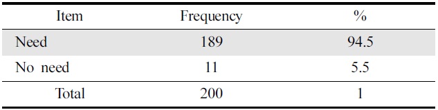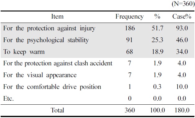 Table 9와 Table 10은 조사대상자의 모터사이클복 필요여부와 그 이유에 관한 사항이다. 조사대상자의 업무 시 전용 모터사이클복 필요성에 관한 문항에서는 ‘필요하다’에 189명(94.5%)의 응답자가 응답하여 조사대상자의 모터사이클 전용복 필요성에 대한 인식이 강한 것으로 나타났다. 또한 그 이유에 대한 다중응답 항목에서는 찰과상, 골절상 등 상해 방지를 위해서가 186명(93%)으로 가장 높은 비율을 차지했으며, 심리적 안정감을 위해서가 91명(45.5%), 보온을 위해서가 68명(34%)의 순으로 나타났다.
