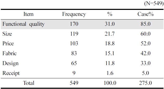 다음으로 모터사이클복 종류 중 가장 선호하는 형태에 대한 결과는 191명(95.5%)의 응답자가 모터사이클 전용 재킷과 바지를 각각 따로 입는 투피스형을 선호하는 것으로 나타났다. 그 다음 선호 아이템은 모터사이클 전용 재킷으로 전체 응답자 중 6명(3%)이 응답하였다. 또한 모터사이클복 구입 시 고려하는 사항에 관하여 다중응답 결과, 외부환경에 대한 신체 보호와 동작 적합성 등과 관련된 기능성이 170명(31.0%)으로 가장 높은 비율로 나타났다. 다음으로 인체에 대한 치수 적합성 항목이 119명(21.7%), 합리적인 가격대에 관한 항목이 103명(18.8%) 순으로 높은 비율을 차지했다. 다음으로 소재의 적합성과 관련 된 항목이 83명(15.1%), 장식성과 관련된 디자인항목이 65명(11.8%), 수납성 항목이 9명(1.6%) 비율로 응답결과가 나타났다. 이를 통해 모터사이클복 구입 시 대다수의 퀵서비스 운송업자는 모터사이클복의 기능성과 치수를 가장 중요시 하는 것을 알 수 있다. 퀵업무 특성상, 업무 시 수납하는 물품이 다양하여 퀵서비스용 모터사이클 재킷의 수납성은 중요한 요인으로 고려되어야 하는 부분임에도 불구하고 기능성이나 치수 적합성 항목에 비해 낮게 나타난 것은 예비설문 조사와 직접 관찰 결과, 대부분의 퀵서비스 기사가 허리에 착용하는 가방이나 포켓이 많은 등산용 조끼를 업무 시 이용하는 것으로 나타났고, 이러한 이유로 직접적으로 수납의 불편사항을 느끼지 못하는 것으로 사료된다. 조사결과는 각각 Table 11과 Table 12에 제시하였다.