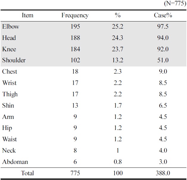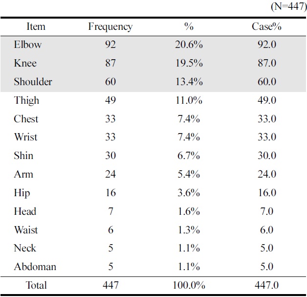 상해를 입은 신체 부위에 대한 다중 응답결과는 Table 17과 같다. 팔꿈치가 93명(20.6%)로 가장 높은 비율로 상해를 입었으며, 무릎이 87명(19.5%), 어깨 60명(13.4%), 정강이 49명(11.0%), 손목과 가슴이 33명(7.4%) 순으로 응답하였다. 특히 찰과상이나 타박상, 골절 등 업무 중 발생할 수 있는 경미한 부상에 대한 보호기능이 강화된 재킷 개발이 시급하다고 파악된다.