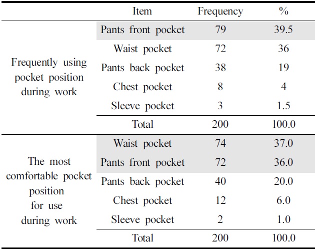 업무 시 휴대 물품을 자주 넣는 부위에 관한 문항은 바지 앞주머니가 79명(39.5%)로 가장 높은 비율을 차지했으며 다음으로 허리주머니 72명(36%), 바지 뒷주머니 38명(19.0%), 가슴주머니 8명(4.0%), 소매 주머니 3명(1.5%) 비율로 나타났다. 또한 업무 시 휴대물품 휴대 시 가장 편리한 포켓 위치에 관한 문항은 허리주머니 74명(37%), 바지 앞주머니 72명(36.0%) 순으로 높게 나타났다. 결국, 휴대물품을 주로 넣는 바지 앞주머니와 허리주머니가 수납하기 가장 편리한 주머니 위치와 일치한 것으로 나타났다. 또한 상반신 주머니 위치를 살펴보면, 허리주머니와 가슴주머니 순으로 휴대하기 편리한 포켓 위치와 자주 수납하는 포켓위치가 높은 비율로 나타났다. 조사결과는 Table 14에 제시하였다.