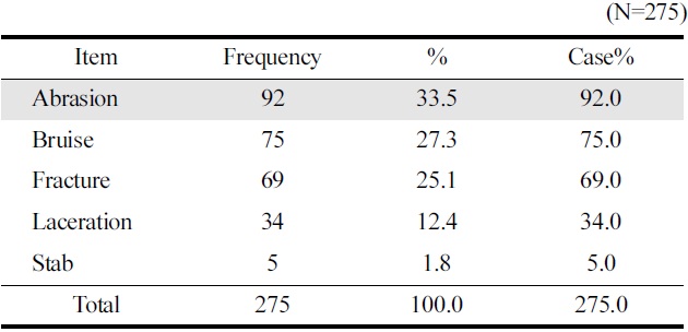 다음으로 주행사고 경험 시 상해 종류에 대한 조사결과는 마찰에 의하여 피부 표면에 입는 수평적으로 생기는 외상인 찰과상이 92명(33.5%)으로 가장 높게 집계되었다. 다음으로 피부에 출혈과 부종이 보이는 타박상이 75명(27.3%), 뼈나 관절 등이 소실되는 상태인 골절이 69명(25.1%)으로 높게 나타났다(Table 16). 이에 잦은 주행사고와 마찰에 의한 피부손상으로부터 1차적인 보호가 가능한 재킷 개발이 필요할 것으로 보여진다.