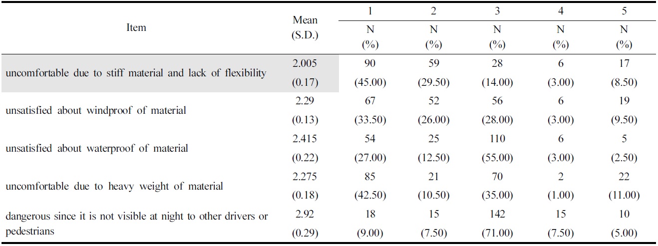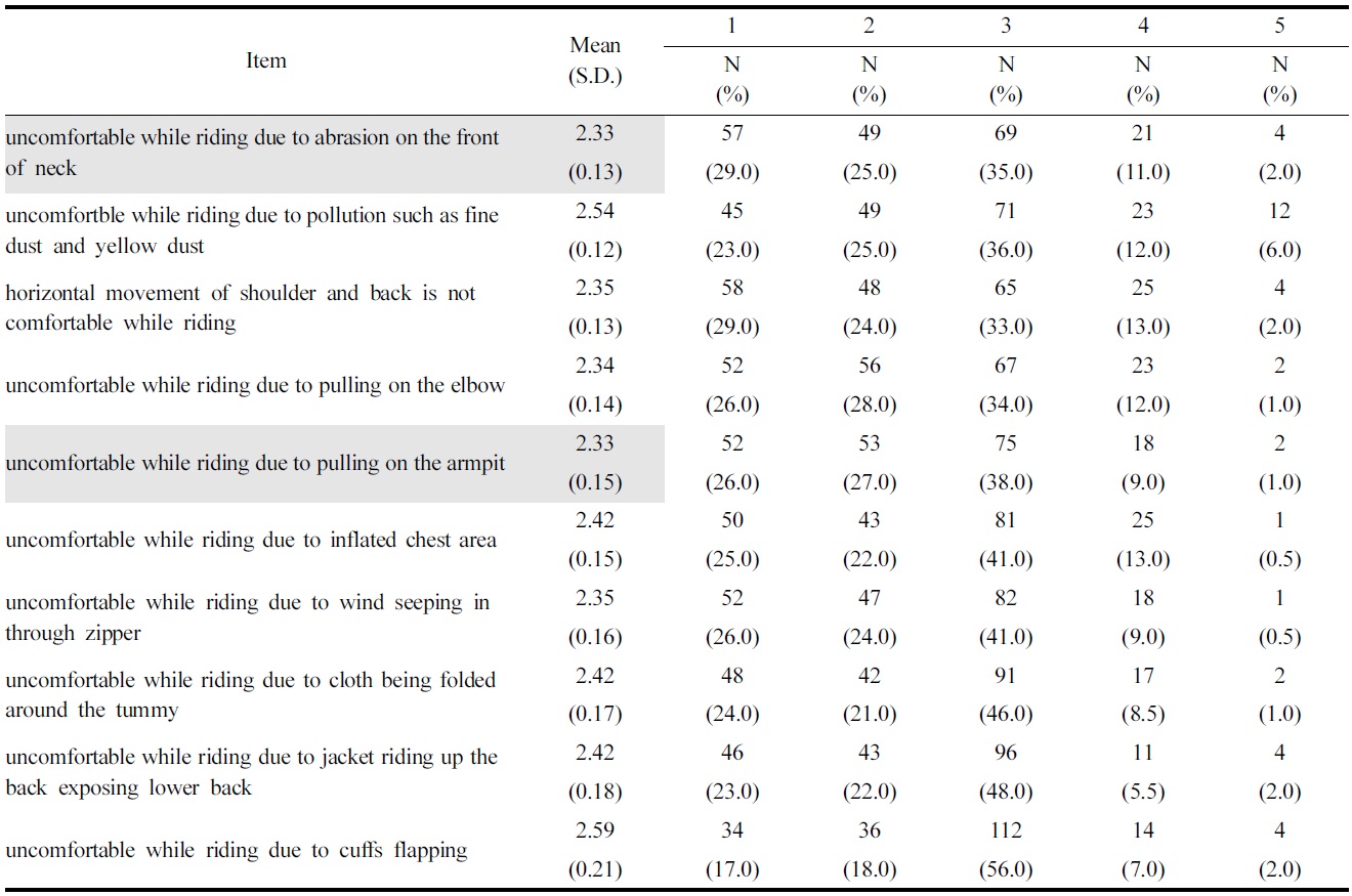 넷째, 기존 모터사이클 재킷의 불만사항에 대한 5점 척도 조사결과, 기존 재킷의 주행 시 착용감 관련사항에서 앞 목이 쓸려서 불편하다와 겨드랑이 부위가 당겨 불편하다가 2.33으로 가장 불편한 것으로 조사되었다. 또 팔꿈치 부위가 당긴다, 어깨와 등 부위 수평방향 움직임이 불편하다, 가슴 부위가 부푼다, 배 부위 옷이 접힌다, 재킷의 뒤 허리 부분이 딸려 올라간다 등의 순으로 불편사항이 높게 나타났다.