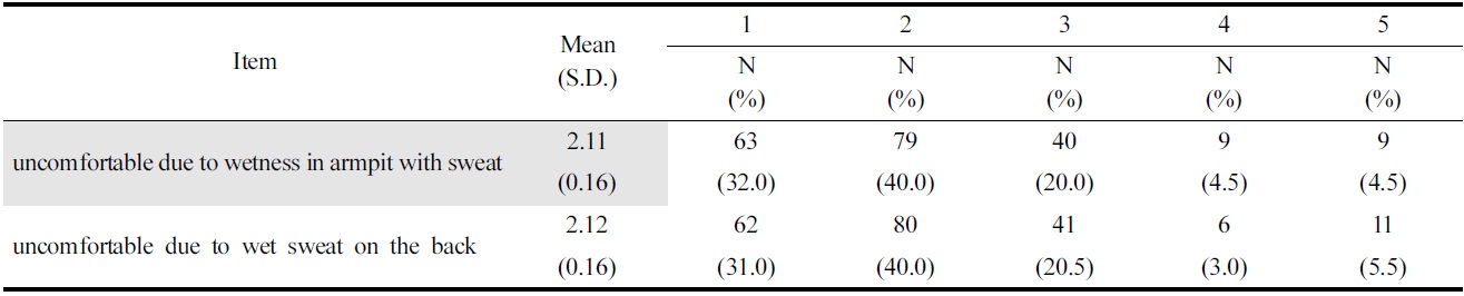 겨드랑이와 등 부위의 흡습성과 통기성에 관한 문항은 신체부위별 착용감과 동일하게 1점에 가까울수록 부정적이며 두 문항 모두 평균 3점 미만으로 불편사항이 있는 것으로 조사되었다. 겨드랑이부위와 등 부위의 땀 흡수력을 개선하기 위해 각 부위별 구성적인 부분에서의 변화와 함께 소재적인 부분에서의 개선이 필요하다고 생각된다. 즉, 겨드랑이와 등 부위의 땀 배출 효과를 위해 환기를 위한 지퍼를 설계하고 메쉬 안감을 사용함으로써 원활한 환기가 가능하도록 설계하여야 한다. Table 19는 부위별 땀 흡수력관련 사항이다.