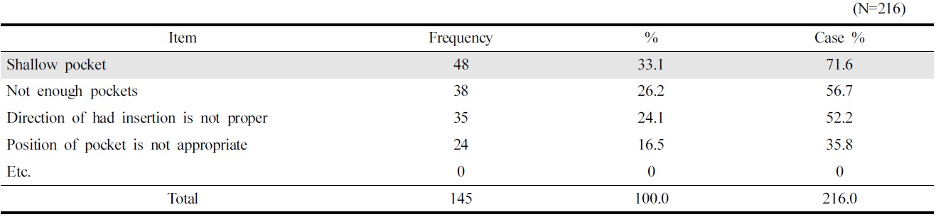 마지막으로 수납성에 대한 불편사항에 대한 조사 결과를 Table 21에 나타내었다. 그 결과 ‘불편사항이 없다’에 133명(66.5%)으로 크게 불편사항을 느끼지 못하는 것으로 집계되었다. 이는 모터사이클복 구매 시 고려사항에 관한 결과와 마찬가지로, 대부분의 퀵서비스 기사의 경우, 기존 모터사이클 재킷의 포켓 수와 용량이 부족하여 재킷 자체의 포켓을 이용하기 보다는 대체 의류제품을 이용하는 것으로 사료되어 직접적으로 수납의 불편사항을 느끼지 못하는 것으로 판단된다. 하지만 퀵서비스 운송작업의 능률을 높이고 기능성을 높이는 모터사이클 재킷 개발을 위한 기초자료를 수집하기 위해 포켓 수납관련 불편 사항의 원인을 조사하여 Table 22에 나타내었다. 포켓으로 인한 불편사항의 원인을 크게 포켓의 위치, 포켓 개수, 포켓 안쪽 깊이, 손 넣는 방향에 따라 나누었다. 그 결과 포켓 깊이가 얕아서 불편하다가 48명(33.1%)으로 가장 높게 나타났으며 그 다음으로 포켓 수가 부족해서 불편하다가 38명(26.2%)으로 나타났다. 이 결과를 바탕으로 기존 모터사이클 재킷의 부족한 포켓 개수와 깊이를 보충한다면 퀵서비스 운송업자의 등산용 조끼 사용이 줄어들고 재킷의 포켓만으로도 충분히 수납성에 만족할 수 있을 것이라 사료된다. 포켓 깊이와 개수 다음으로 손 넣는 방향이 알맞지 않아서 불편하다가 35명(24.1%)으로 나타났고, 포켓 위치가 적합하지 않아서 24명(16.5%)으로 가장 낮은 빈도로 나타났다. 손 넣는 방향성 문제를 고려해 손을 포켓에 넣는 동작이 자연스러울 수 있는 방향을 고려해 포켓입구를 디자인해야 할 것으로 판단된다. 예를 들어, 허리 포켓의 경우, 사이드로 입구를 만들어 주거나, 가슴 포켓의 경우도 수직으로 손이 들어가기 보다는, 옆으로 자연스럽게 손이 향할 수 있도록 디자인되어야 할 것으로 사료된다. 마지막으로 포켓 위치가 적합하지 않아서 불편하다는 항목에 대해서는 모터사이클 주행동작과 퀵서비스 운송업무의 특징적인 사항을 파악하면서 휴대물품의 종류와 함께 고려하여 포켓을 설계한다면 개선될 것으로 판단된다.