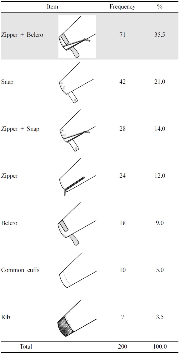 마지막으로 디자인 관련 문항에서는 지퍼와 벨크로 혼합형태의 소매와 벨크로 형태 밑단과 스탠드칼라와 벨크로 혼합형태의 칼라가 가장 선호도가 높은 것으로 나타났다.