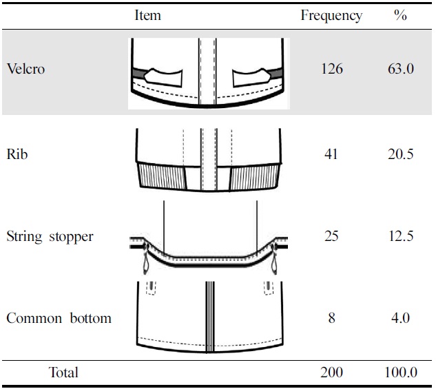 재킷 밑단 형태의 경우, 재킷 소매 형태와 마찬가지로 시판되는 기존복을 바탕으로 일자형, 내부 고무 스트링형, 벨크로형, 고무밴드형 등 4가지 형태로 분류하였다. 벨크로 형태를 선호한다는 응답이 126명(63%)으로 가장 높았다. Table 24는 선호하는 재킷 밑단 형태 관련사항이다.