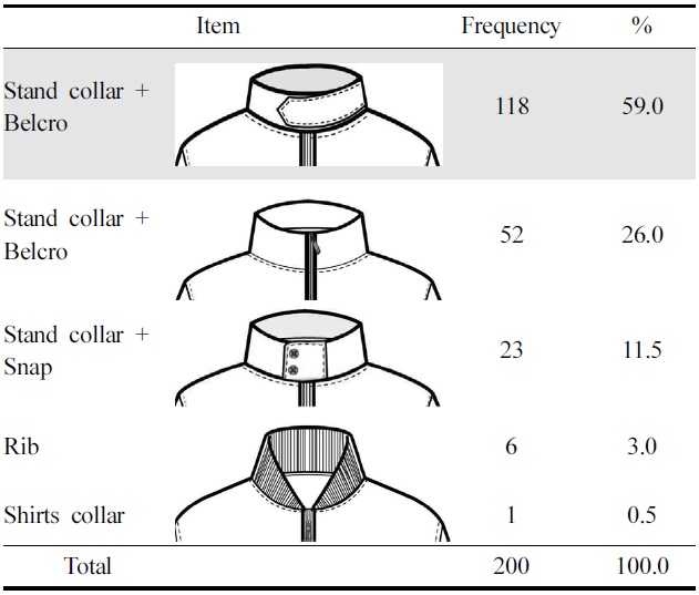 재킷 칼라 형태 선호도에 대한 설문결과는 스탠드칼라와 벨크로의 혼합형태가 118명(59.0%)로 가장 높은 비율을 차지하였다. 자세한 내용은 Table 25와 같다.