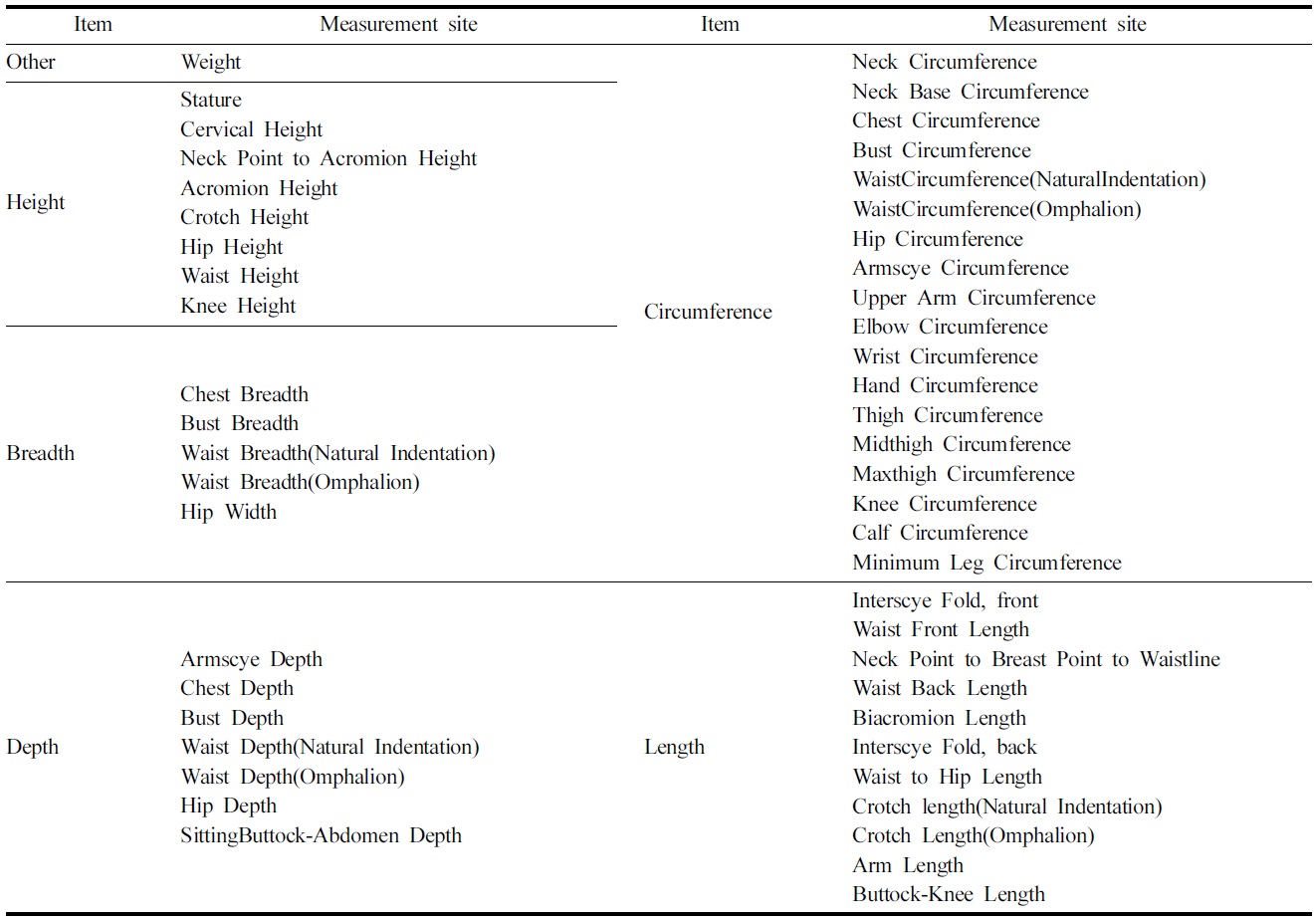 인체 계측항목은 국민표준체위조사에서 제시한 48항목과 목옆점어깨높이와 넙다리최대둘레를 추가하여 총 50항목이다. 그 항목은 높이 8항목, 너비 5항목, 두께 7항목, 둘레 18항목, 길이 11항목, 기타 1항목이고, 넙다리최대둘레는 넙다리의 가장 돌출된 부위를 계측하였다.