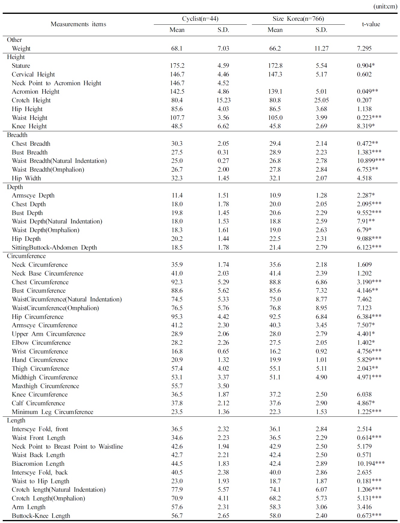 본 연구에서는 남자 고등학교 사이클 선수의 인체를 직접 계측한 평균치와 ‘제 6차 국민표준체위조사(Size Korea)’의 일반 남자 고등학생의 평균 인체치수를 비교 분석하였다.