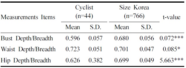 Table 3은 사이클 선수와 남자 고등학생의 인체 치수인 너비, 두께에 따른 가슴, 허리, 엉덩이 부위의 편평률을 구하였고, 두 집단의 차이를 t-test 한 결과를 제시하였다.