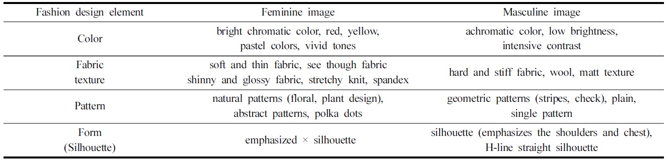 선행연구에 공통적으로 나타난 성별 이미지를 가진 패션디자인 요소를 정리하면 다음의 표와 같다(Table 1).
